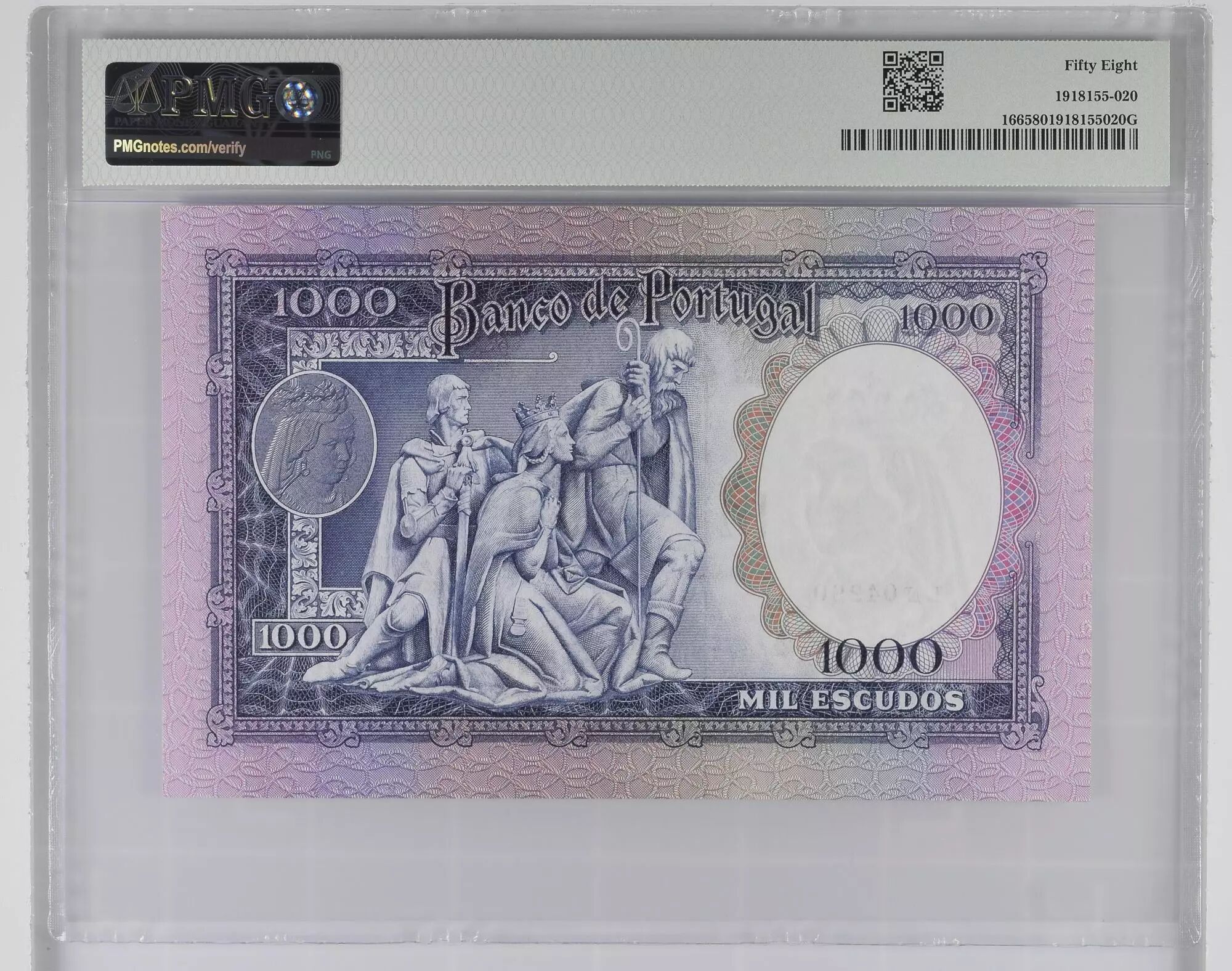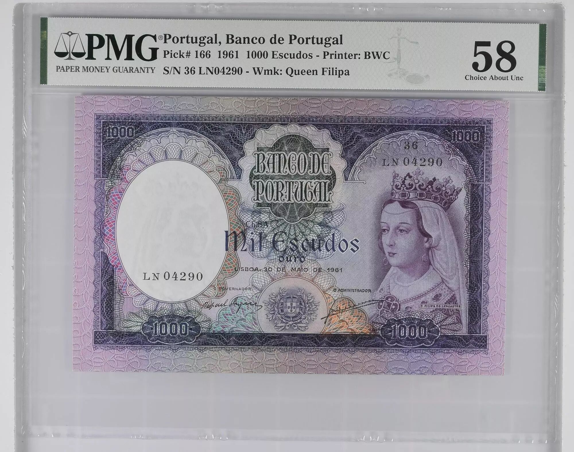 Home > > Portugal 1000 Escudos - Reine Filipa - 20-06-1961 - Serial LN - PMG 58