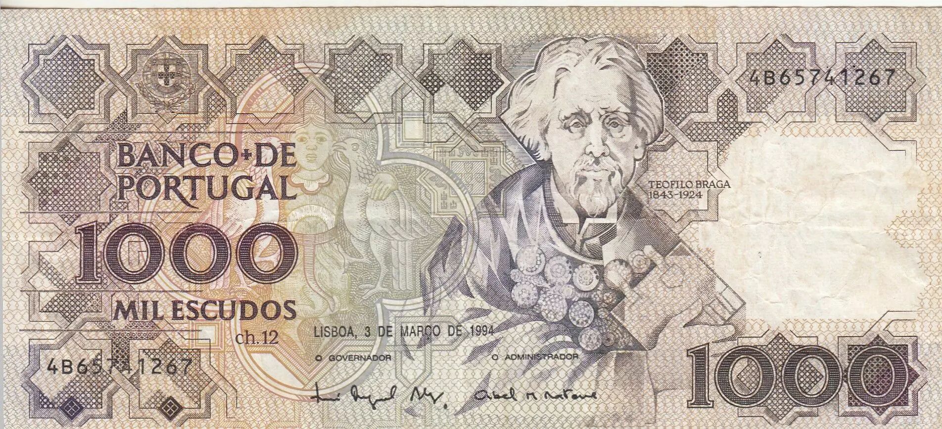 Le billet de 1000 Escudos du Portugal, émis le 3 mars 1994, fait partie de la Série B et met à l'honneur Teófilo Braga, une figure éminente de la littérature et de la politique portugaise. Braga fut un écrivain prolifique, historien et l'un des présidents provisoires de la Première République portugaise. Son rôle en tant que penseur, défenseur de la République et pionnier des réformes culturelles a marqué l?histoire du pays. Sur le recto du billet, un portrait détaillé de Teófilo Braga est présenté, soulignant son importance dans la modernisation des idées au Portugal. Le verso du billet illustre des éléments de la culture littéraire, rappelant son attachement à la poésie et à l'écriture. Ce billet de 1000 Escudos, émis avant l'introduction de l'euro, est un hommage à l?intellectuel qui a grandement influencé la société portugaise au tournant du XXe siècle. En tant que tel, il représente à la fois un symbole historique et un témoignage de l'importance de la culture dans la construction de l'identité nationale.