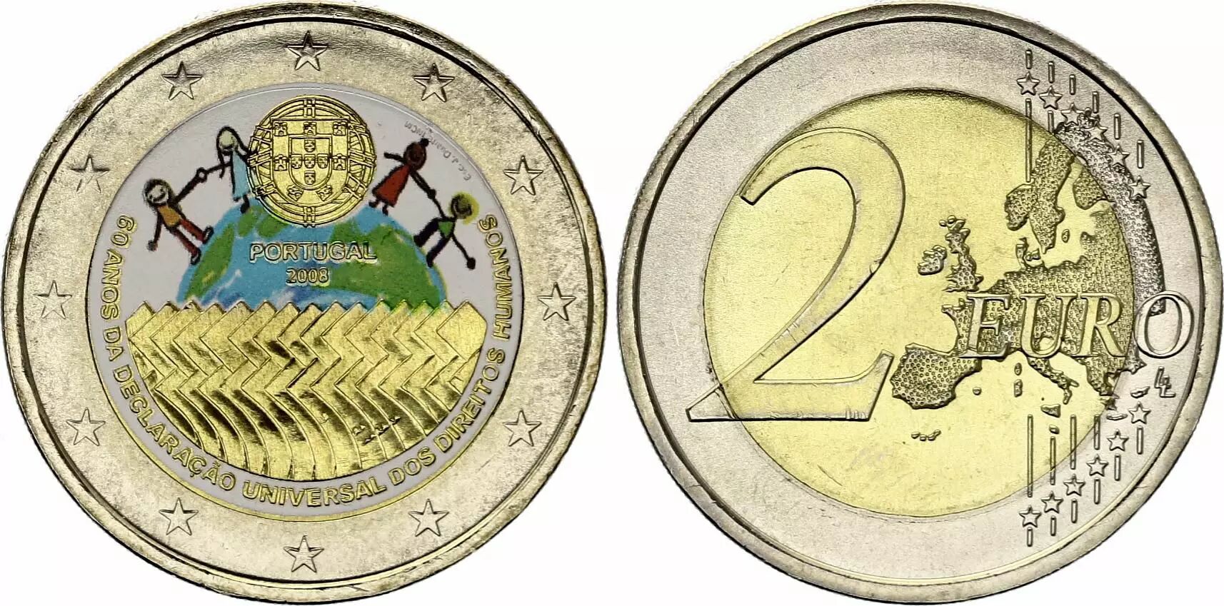 Pièce Portugal 2 Euros - Droits de l'homme - Colorisée - 2008
