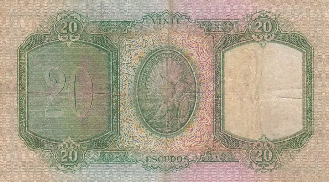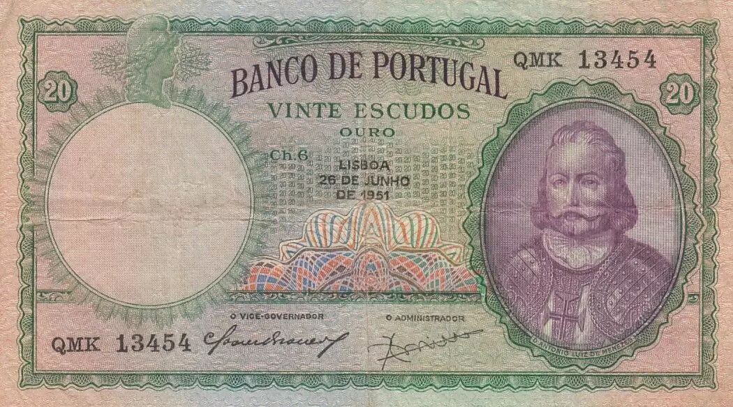 Banknote Portugal 20 Escudos - Antonio luiz de Menezes - Serial QMK - 1951