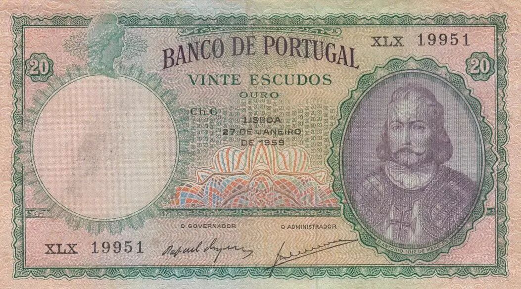 Accueil > Archivage > Portugal 20 Escudos - Antonio luiz de Menezes - Série XLX - 1959
