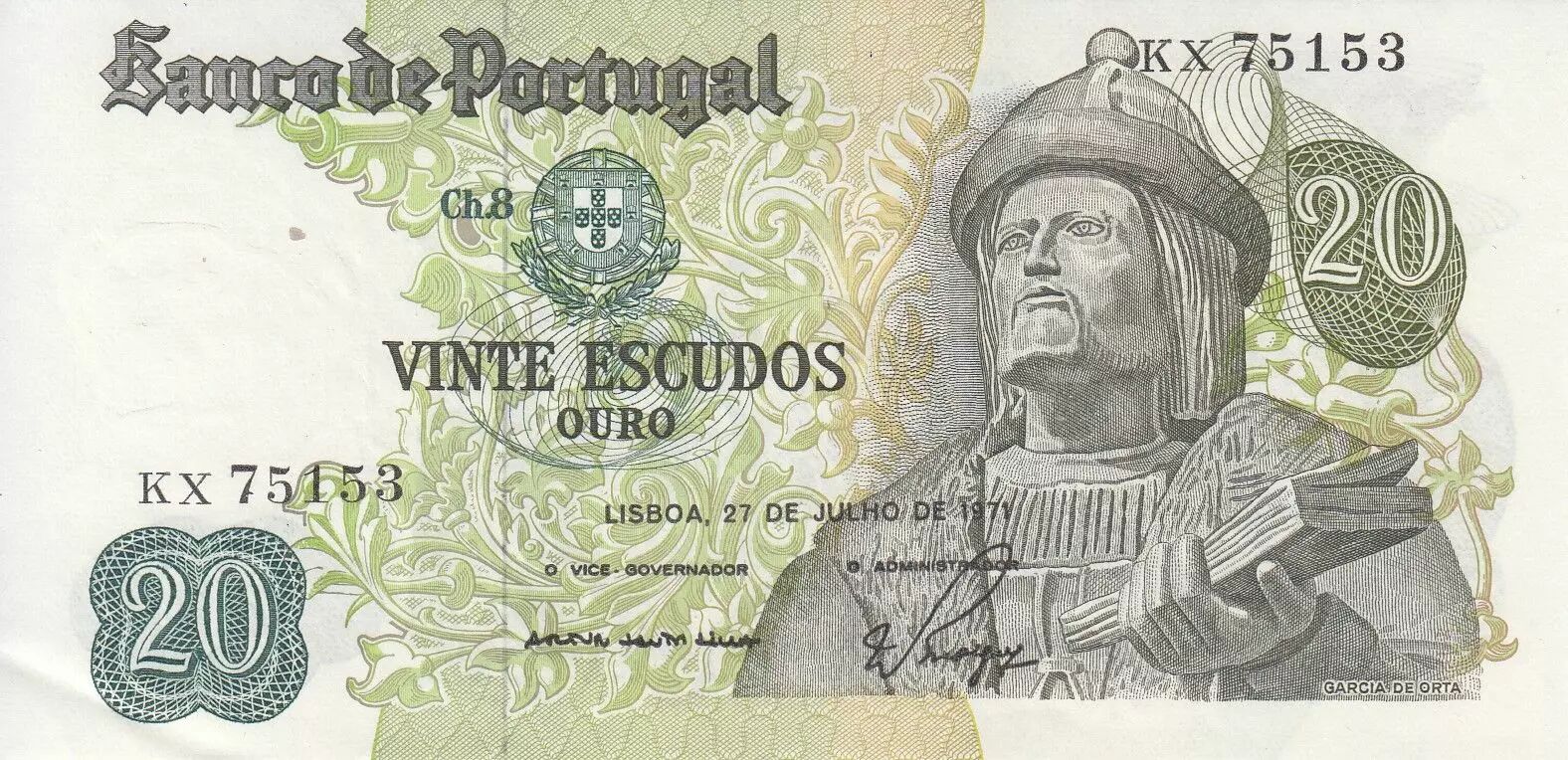 Accueil > Billets du Monde > Billets d'Europe > Portugal > Portugal 20 Escudos - Garcia de Orta - 27-07-1971 - Série KX