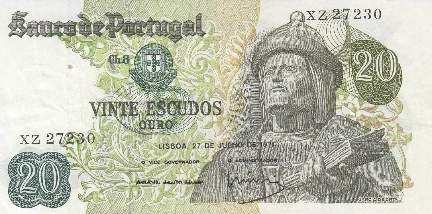 Accueil > Archivage > archivage-Billets du Monde > Portugal 20 Escudos - Garcia de Orta - 27-07-1971 - Série XZ