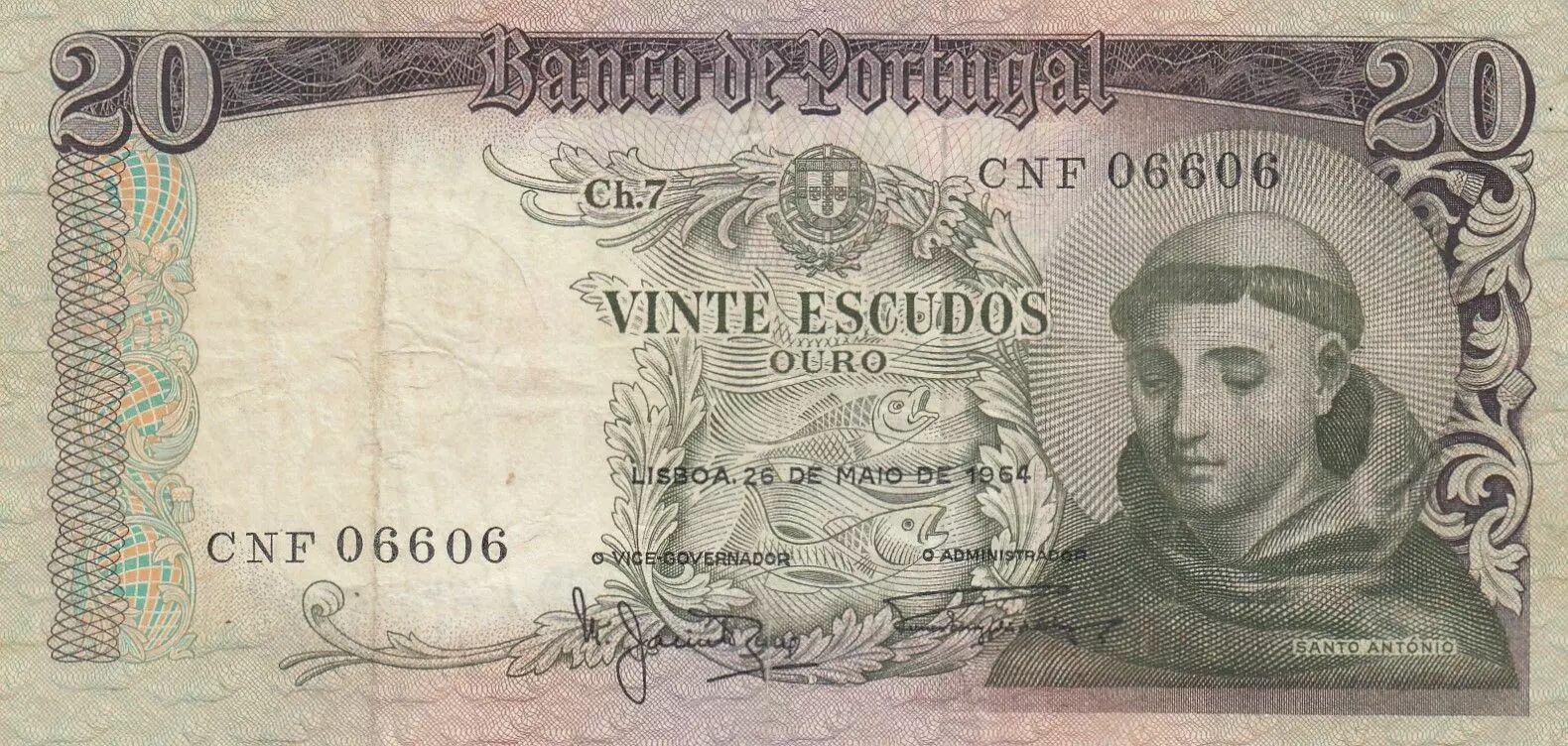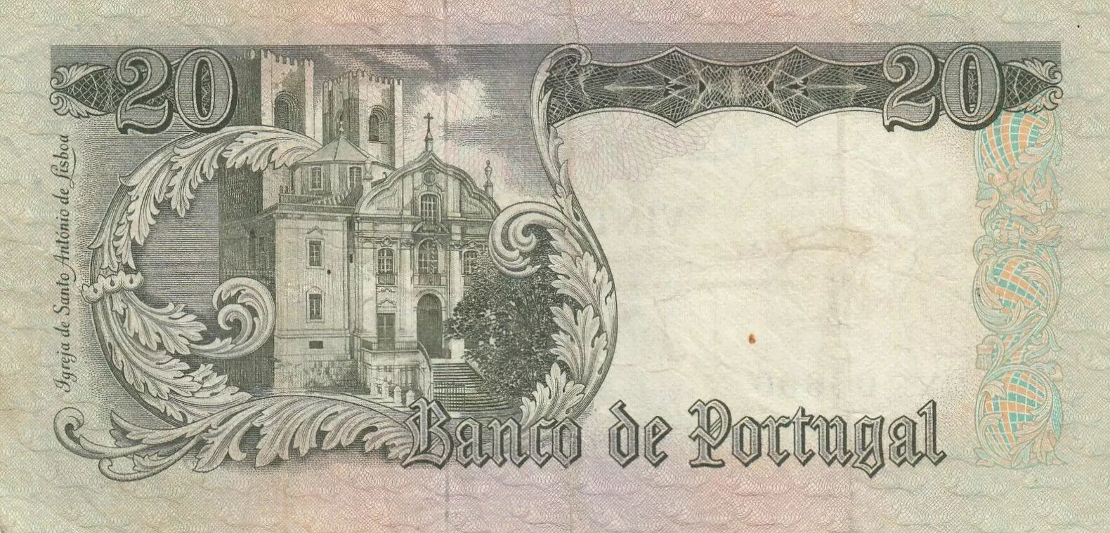 Le revers du billet affiche des informations supplémentaires sur Saint António et des motifs décoratifs, soulignant le savoir-faire artistique portugais. La valeur de 20 Escudos est clairement visible, témoignant de l'importance de ce billet dans la numismatique portugaise.