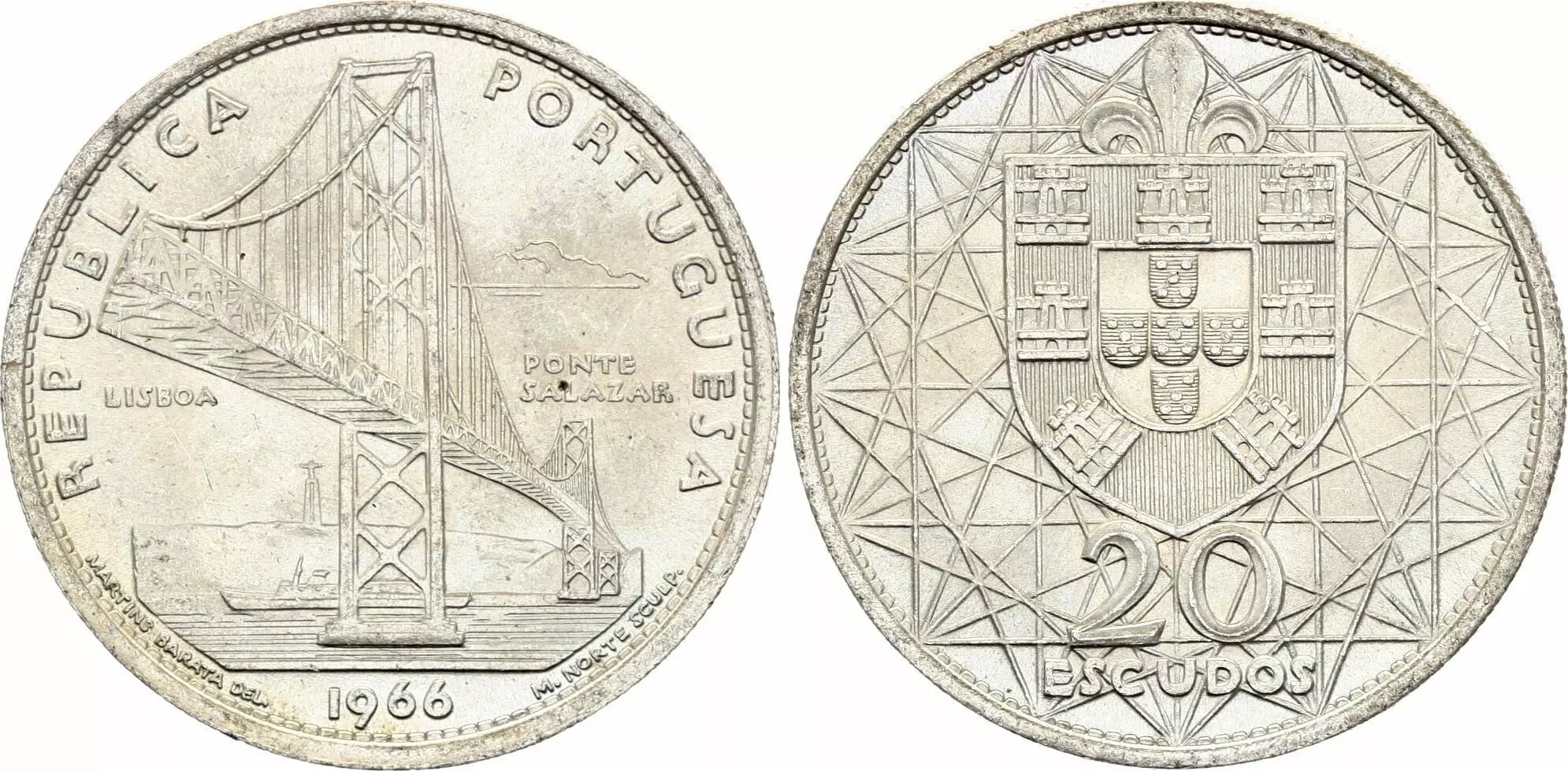 This coin is a 20 escudos issued by Portugal in 1966. The coin is struck in silver and has a face value of 20 escudos, the currency of Portugal at the time.