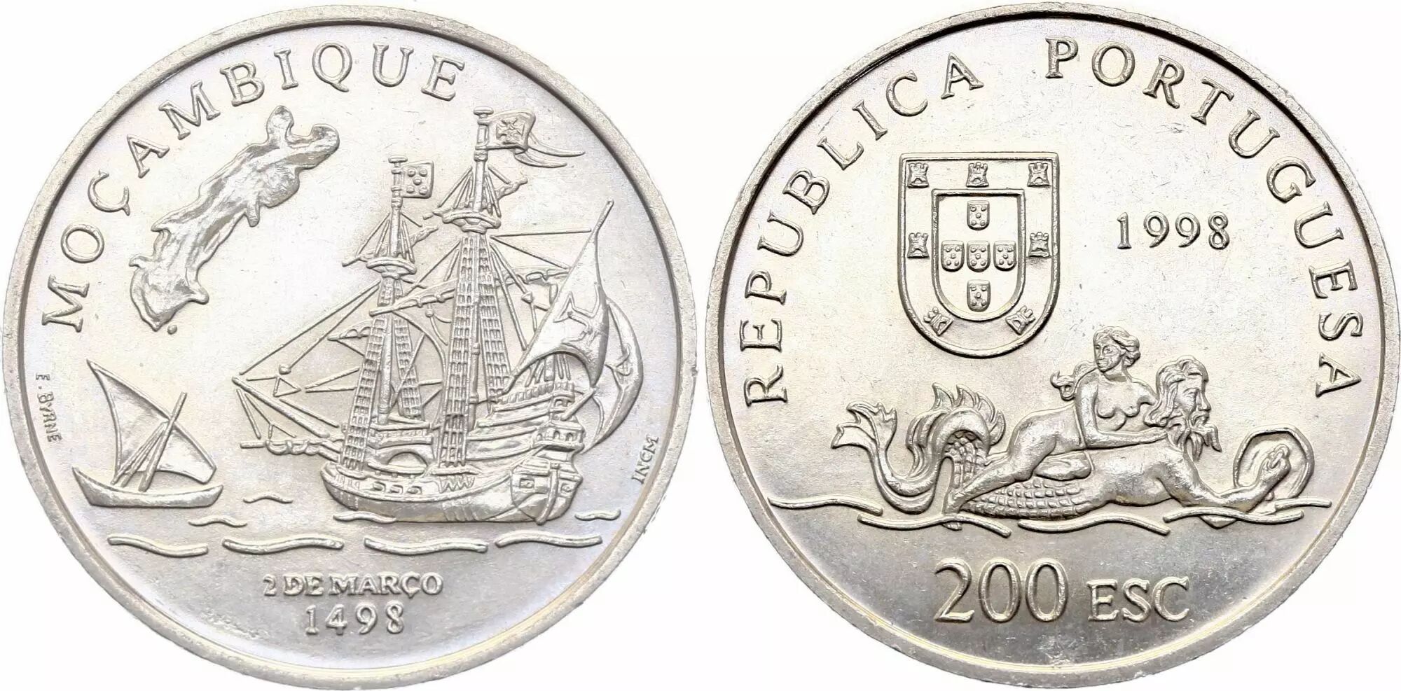 Au revers de la pièce, une représentation symbolique de la découverte maritime est mise en avant, intégrant des éléments tels que des cartes anciennes et des vaisseaux qui rappellent les grandes explorations des navigateurs portugais. La découverte du Mozambique a non seulement ouvert de nouvelles routes commerciales mais a également joué un rôle clé dans l?histoire de la colonisation portugaise en Afrique.