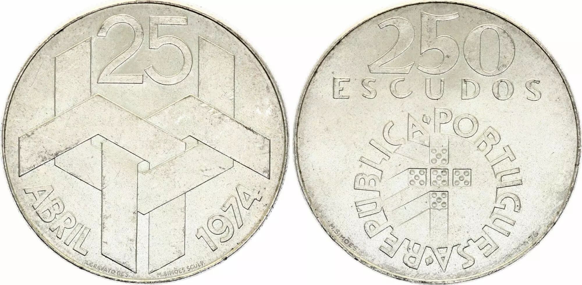 The 250 Escudos coin commemorates the Carnation Revolution of 1974 in Portugal. Struck in silver, this coin has a nominal value of 250 Escudos, the currency in circulation in Portugal at the time of its issue.