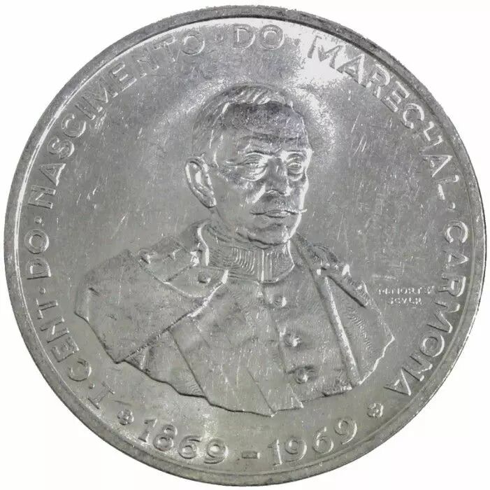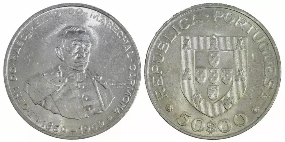 The reverse of the coin is dedicated to Oscar Carmona. It features a portrait of the former president. The face value of "50 escudos" is also indicated on this side. The 1969 50 escudo coin is a silver commemorative coin that pays tribute to an important figure in Portuguese history while showcasing the country's national symbols.