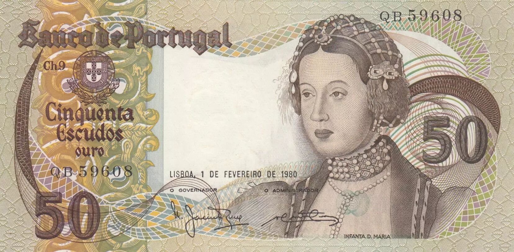 Accueil > Archivage > archivage-Billets du Monde > Portugal 50 Escudos - Infante D. Maria - 01-02-1980 - Série QB