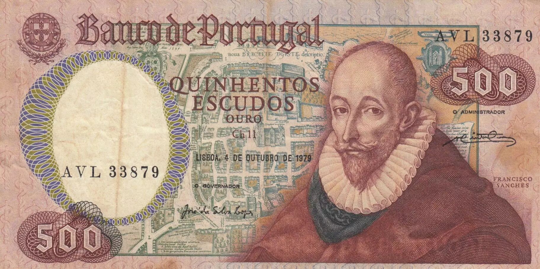 Accueil > Archivage > archivage-Billets du Monde > Portugal 500 Escudos - Francisco Sanches - Braga - 04-10-1979 - Série AVL