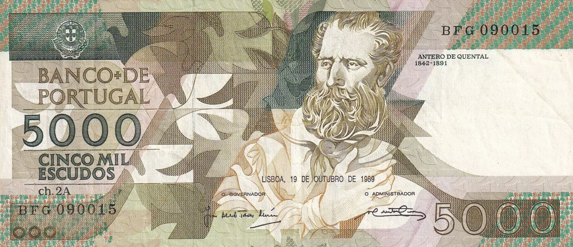 Home > > Portugal 5000 Escudos - Antero de Quental - 1989 - VF to XF - P.184c
