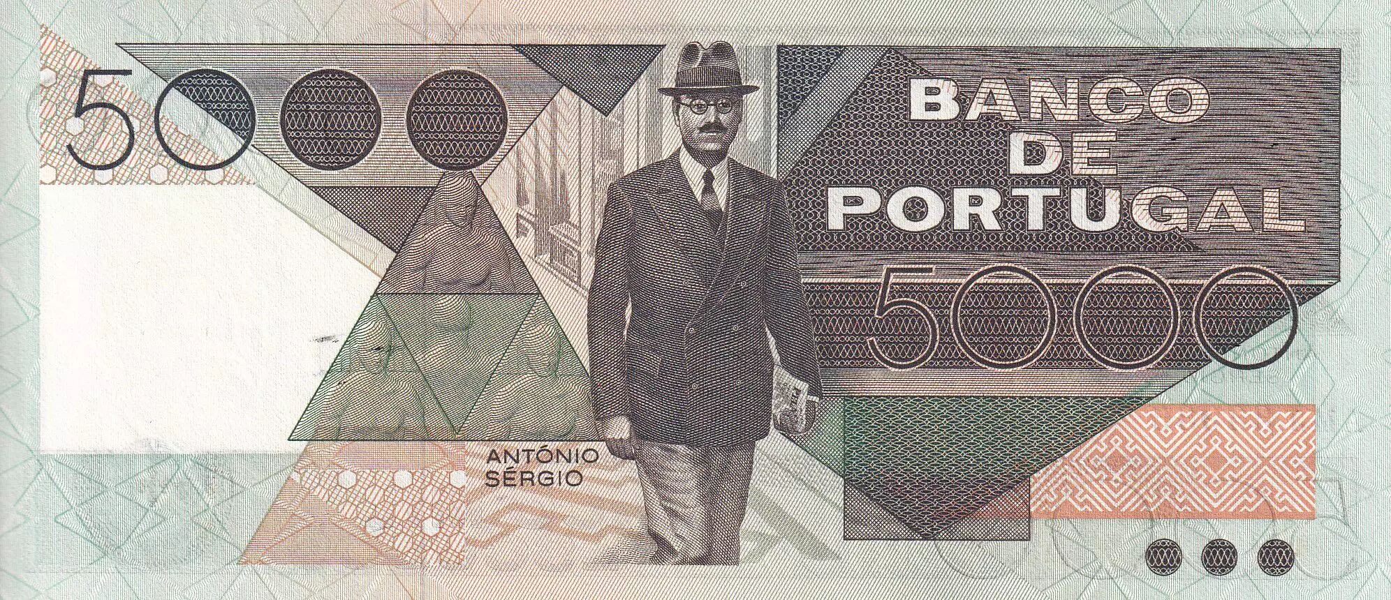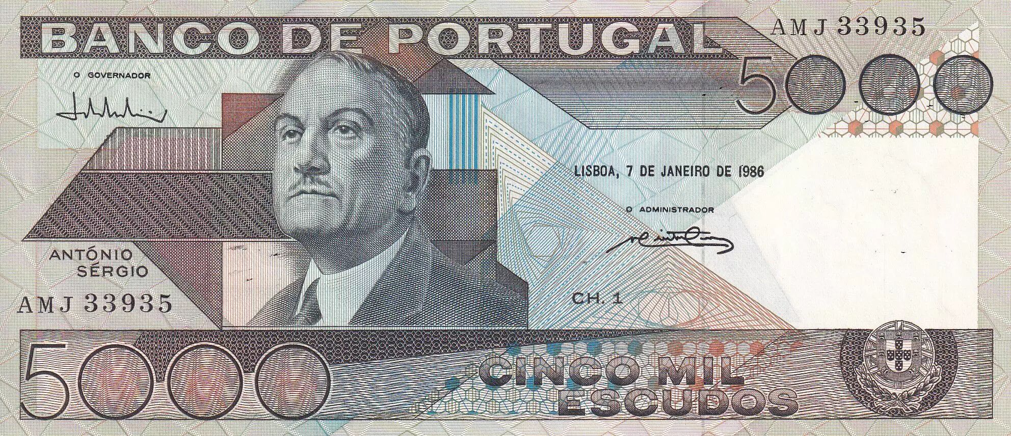 Banknote Portugal 5000 Escudos - Antonio Sergio - 07-01-1986 - Serial AMJ - P.182e
