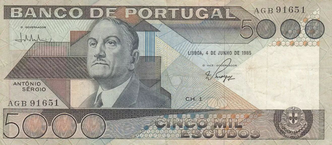 Banknote Portugal 5000 Escudos - Antonio Sergio de Sousa - Serial AGB - 1985