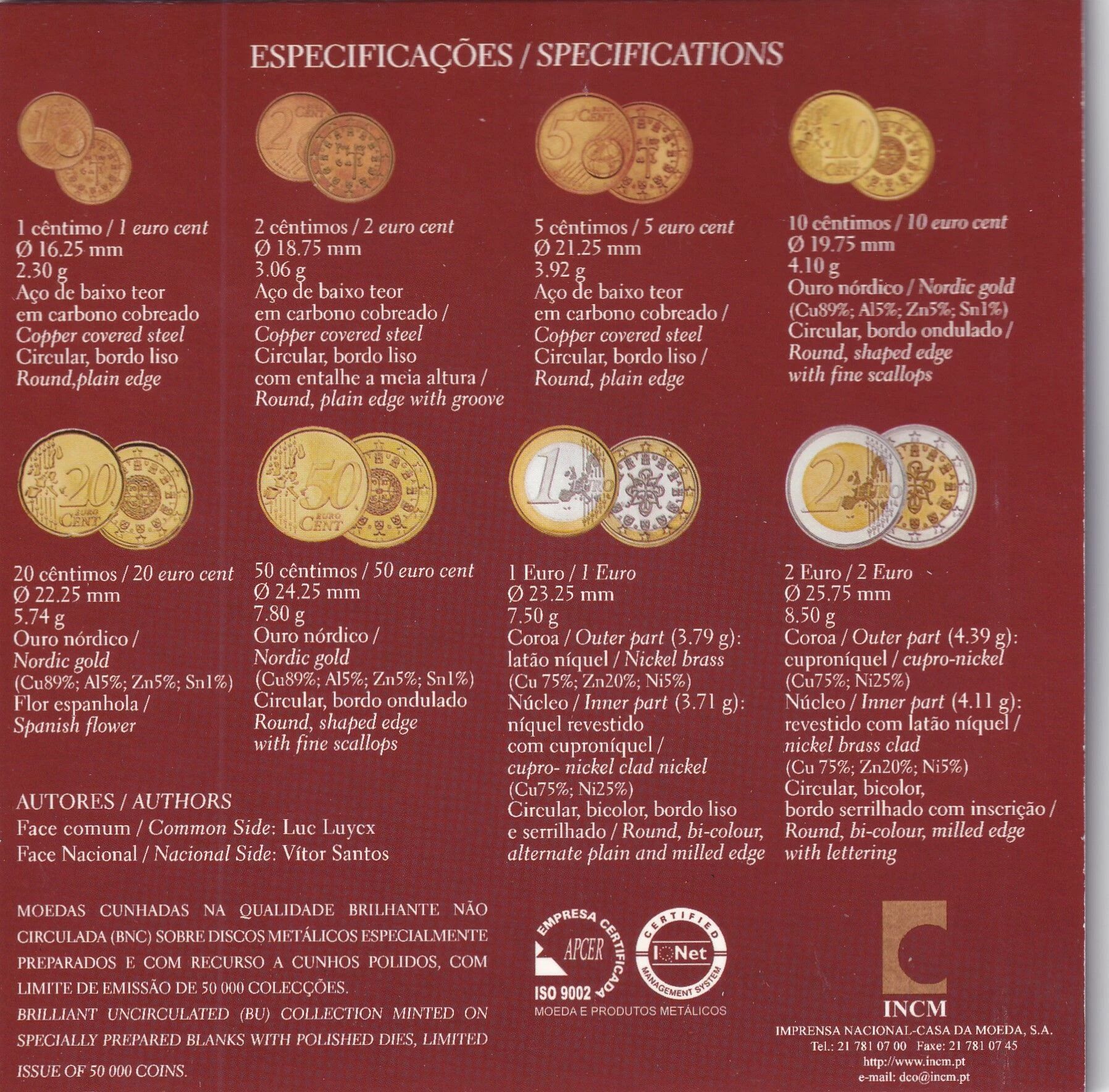 Les pièces de 1, 2 et 5 centimes sont en acier cuivré. Elles représentent le premier sceau royal de 1134. Les pièces de 10, 20 et 50 centimes sont en alliage de "Nordic gold". Elles arborent le sceau royal de 1142. Les pièces de 1 et 2 euros sont bimétalliques. La pièce de 1 euro montre le sceau royal de 1144. La pièce de 2 euros représente le château de Guimarães.