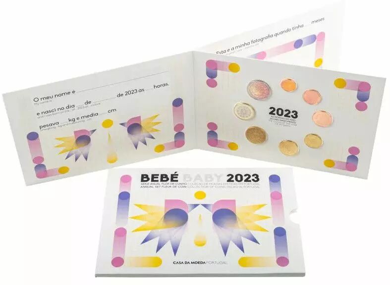 Pour marquer une naissance l'Institut monétaire portugais a rassemblé les pièces au milésime 2023 dans un blister personnalisable avec les premiers instant du bébé.