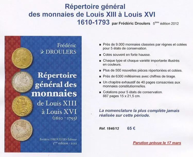 Rep. Gal des Monnaies 1610-1793 Droulers 2012. Delivery after the 18 april 2012. Rep. Gal des Monnaies 1610-1793 Droulers 2012. 9000 coins of LOUIS XIII to LOUIS XVI (1610 to 1793). 887 pages.