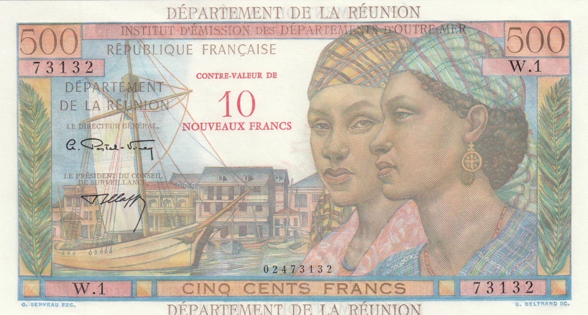 This banknote is an issue from Réunion, with a face value of 10 francs. It is an overprinted banknote, initially issued with a value of 500 francs, then modified with the overprint "10 NF" (new francs). It belongs to the series identified by the code "W.1". The period of issue of this banknote extends from 1967 to 1971. Its dimensions are 180 mm in length and 96 mm in width.