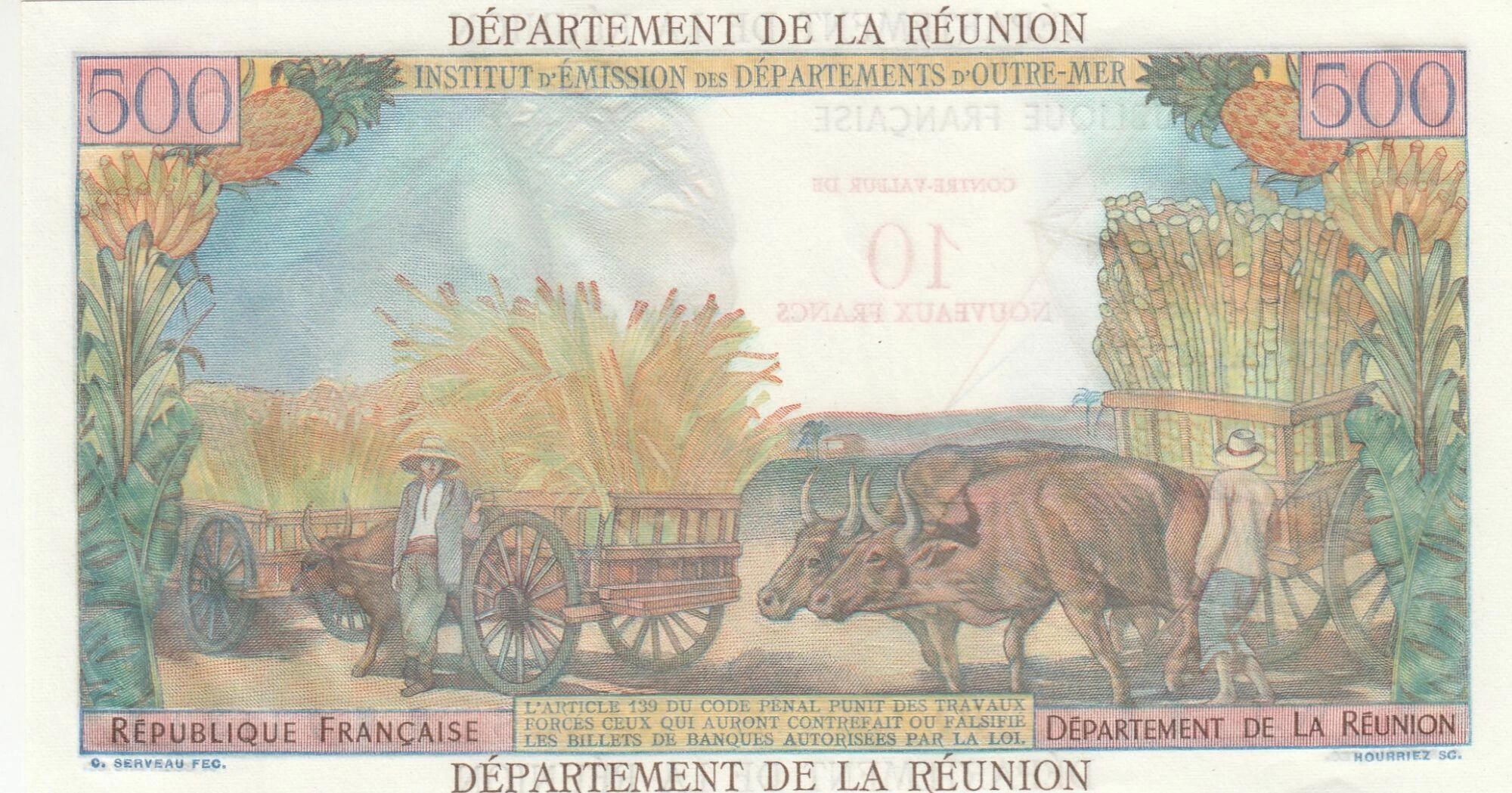 Au verso, le billet illustre une scène rurale. On y voit des chariots agricoles, traditionnellement tirés par des b?ufs, ainsi que des fermiers. Cette représentation met en avant les activités agricoles et le mode de vie rural de La Réunion à l'époque de l'émission du billet.