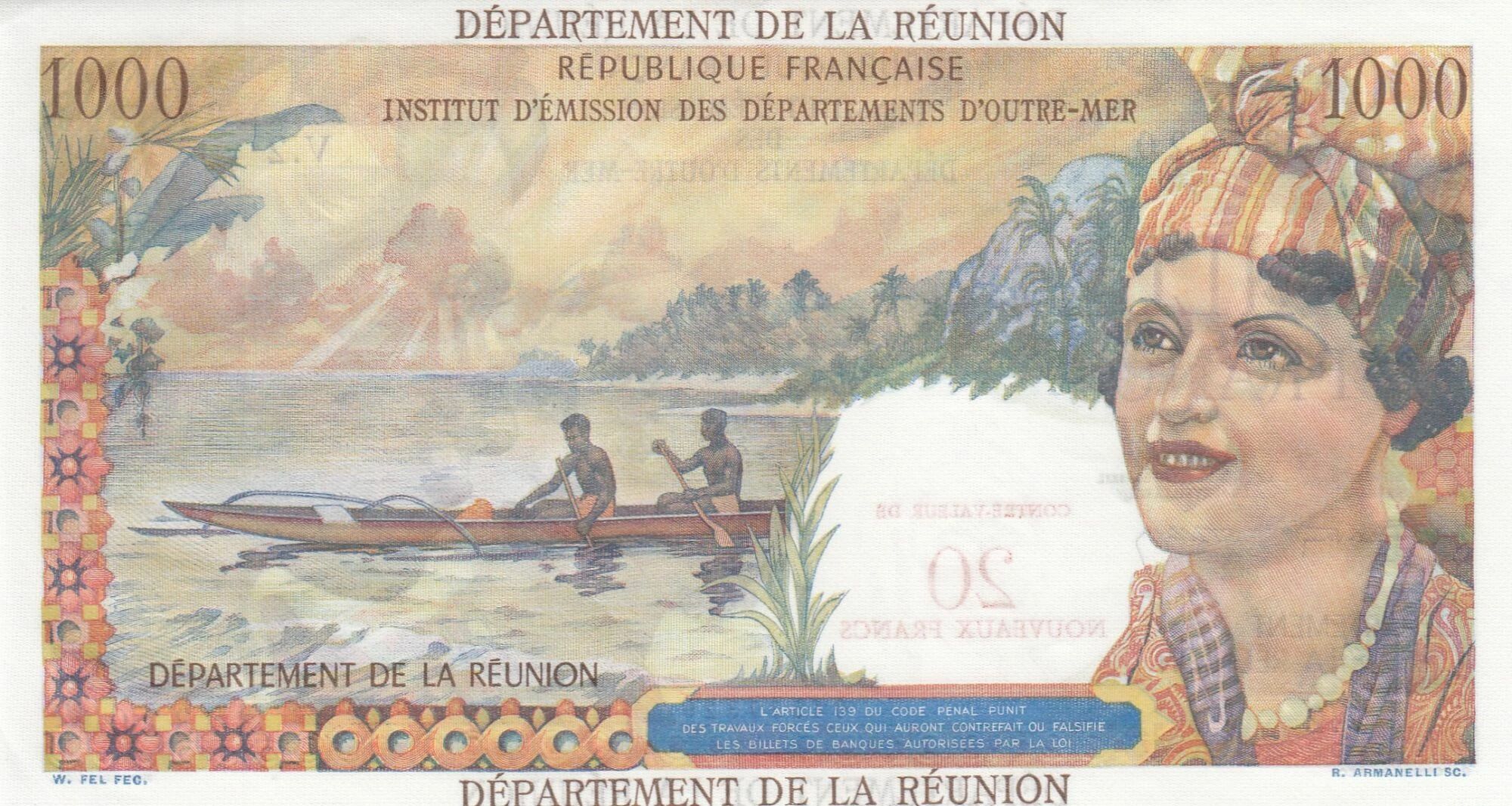 On the back, the banknote depicts men sailing on a boat, accompanied by a young woman. This scene potentially evokes a local activity or an aspect of daily life in Réunion. The composition of this scene, with its characters and environment, is a distinctive element of the banknote.
