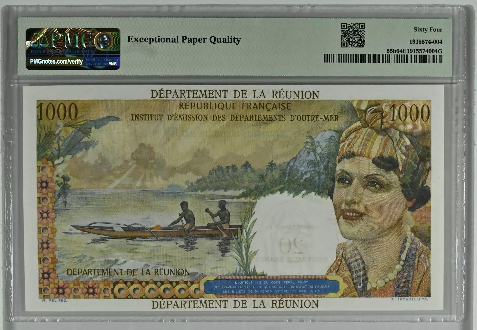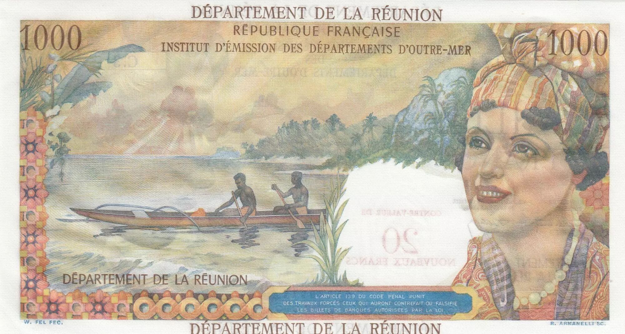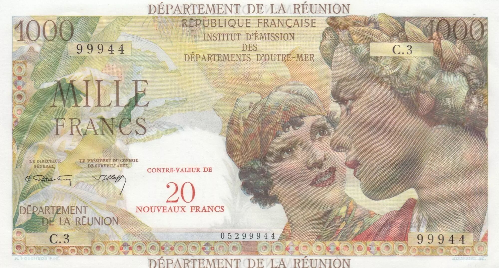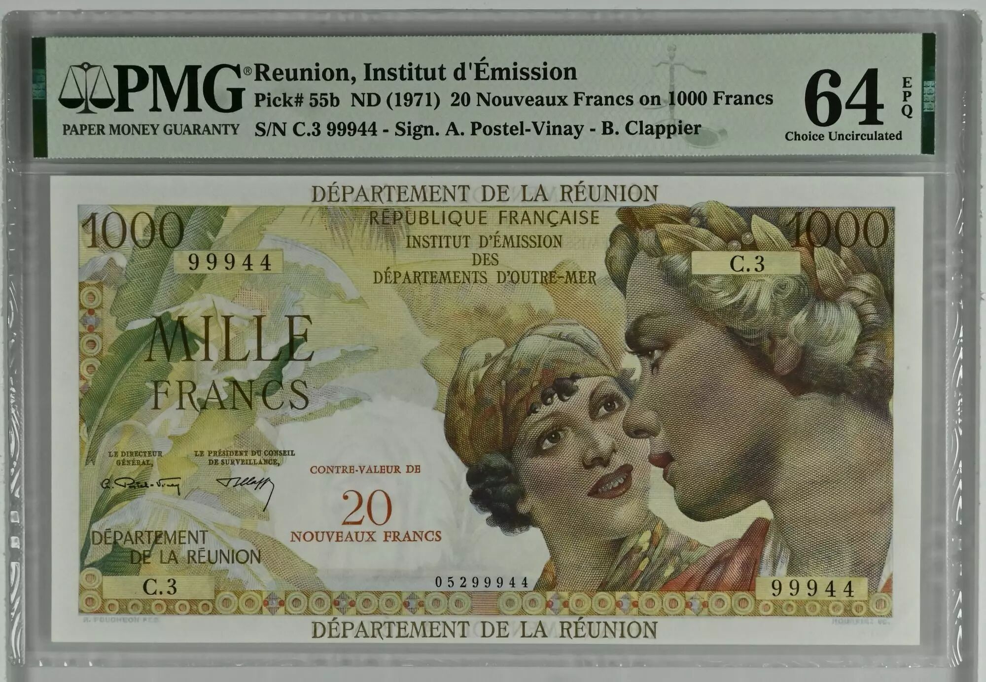 Accueil > Archivage > Réunion 20 NF / 1000 Francs - Union Française - Surchargé - 1967 - Série C.3 - PMG 64 EPQ - Kol.446b