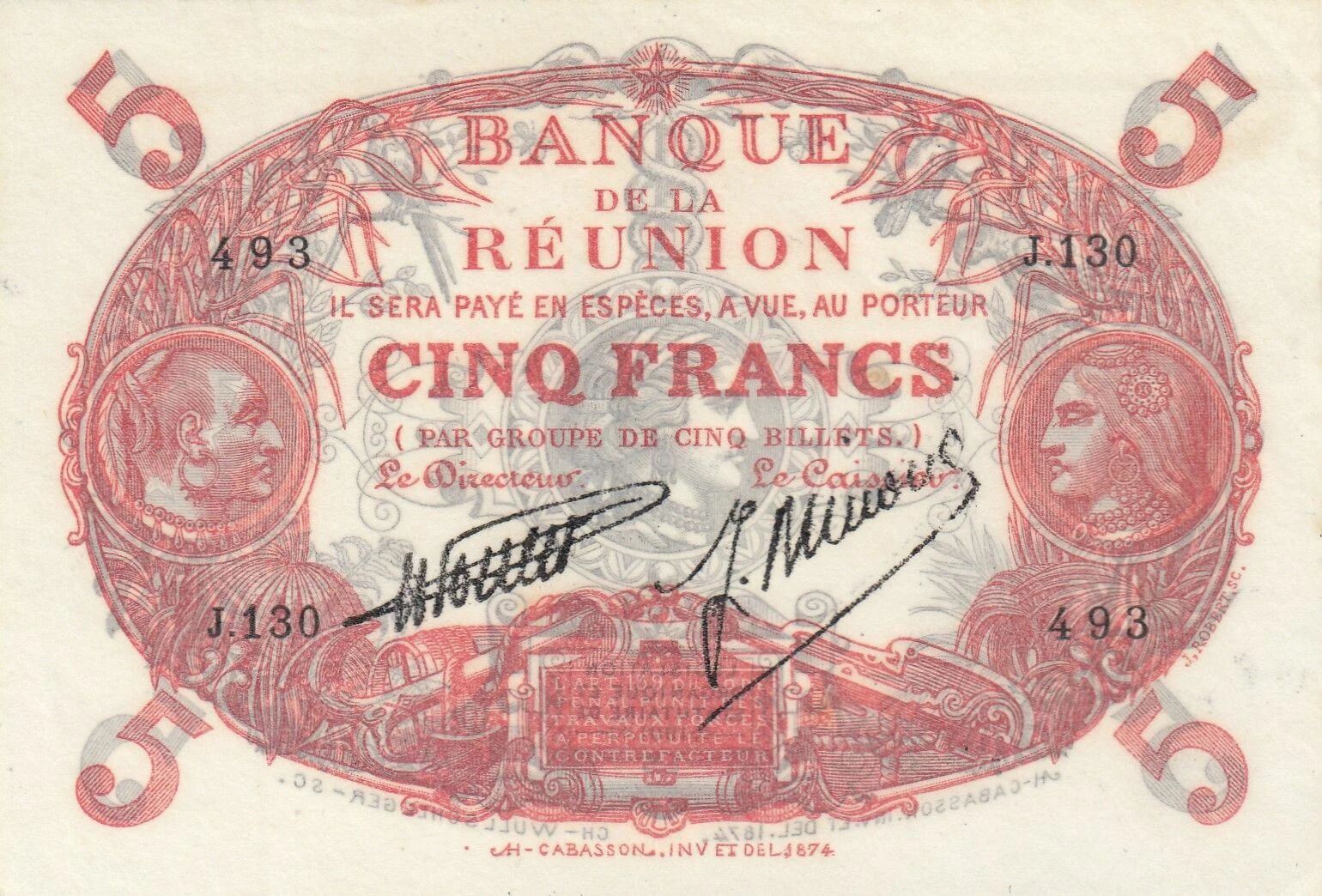 Le recto du billet présente deux têtes d'indigènes représentées dans des médaillons. À droite, une femme est portraiturée, tandis qu'à gauche, un homme est représenté. Ces médaillons sont entourés d'une végétation tropicale luxuriante, évoquant le paysage de la Réunion. Les inscriptions en écriture latine mentionnent "BANQUE DE LA RÉUNION" et la promesse de paiement au porteur de "CINQ FRANCS". La mention "(PAR GROUPE DE CINQ BILLETS.)" est également présente. Les signatures du Directeur et du Caissier figurent sur le billet, accompagnées des chiffres "5" répétés. Le numéro de série "482 J.130" apparaît deux fois. Un avertissement légal, faisant référence à l'Article 109 du Code Pénal, met en garde contre la contrefaçon. La signature "H- CABASSON INV ET DEL 1874" ainsi que "J. ROBERT SC." indiquent les artistes impliqués dans la conception et la gravure du billet. Guillaume-Alphonse Harang, connu sous le nom de Guillaume Cabasson, est crédité comme dessinateur, tandis que Charles-Jules Robert est identifié comme le graveur.