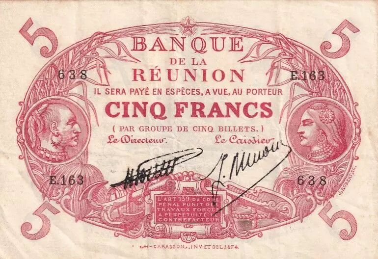 Billet Réunion 5 Francs Cabasson, type 1901 Rouge (1938) Série E.163