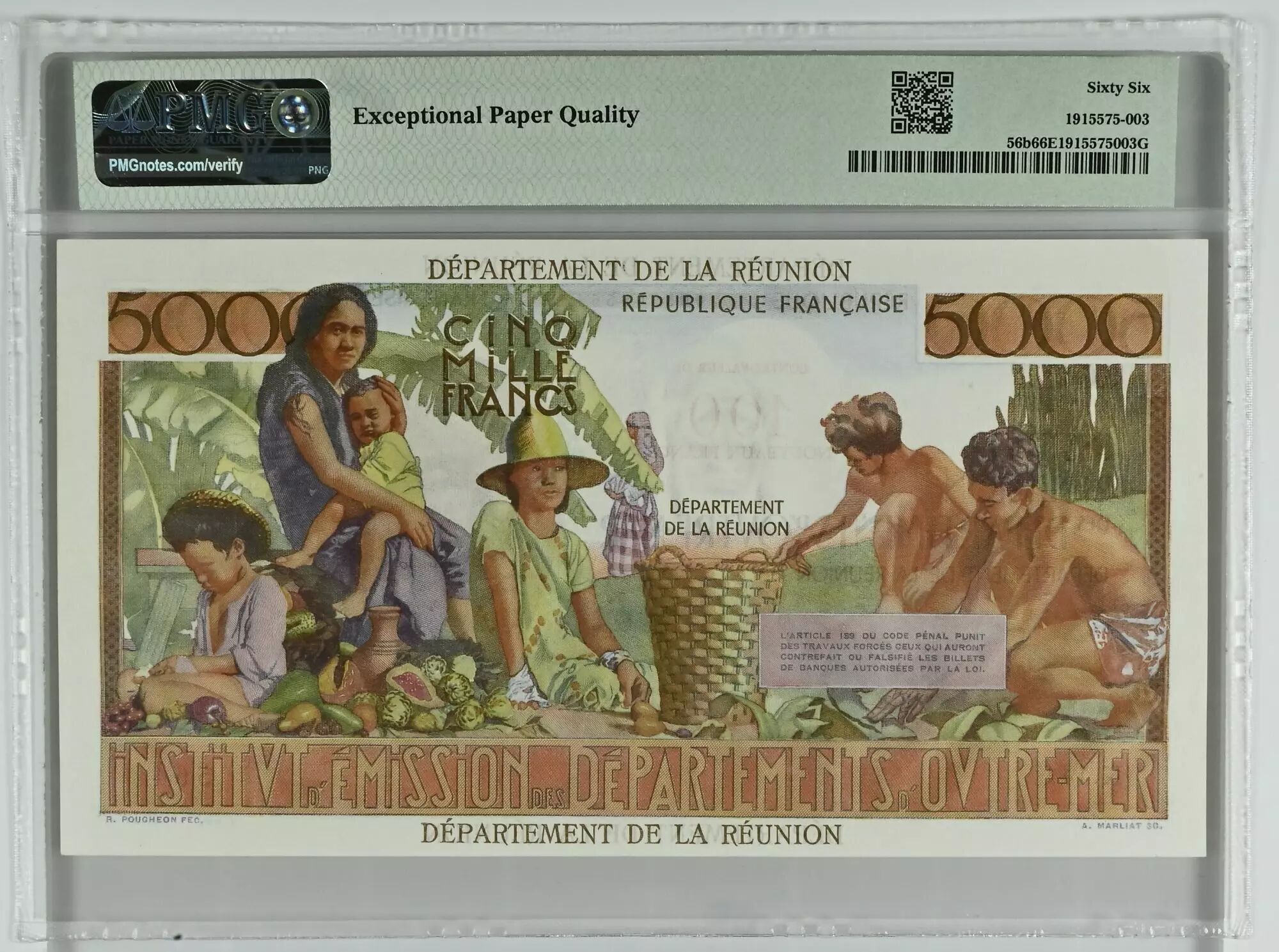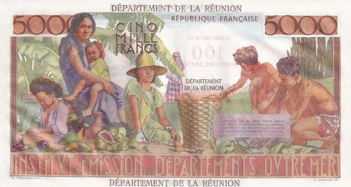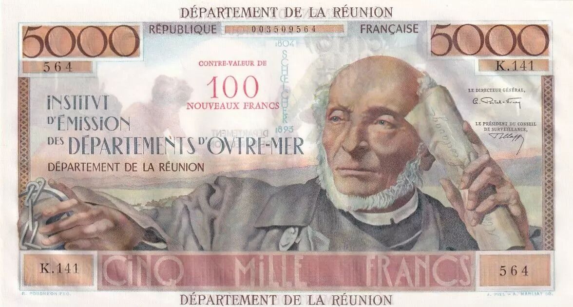 Home > French Banknotes > Colonies and Overseas Territories > Réunion > Réunion 5000 Francs - Schoelcher - Overloaded 100 NF - 1967 - Serial K.141 - PMG 66 EPQ