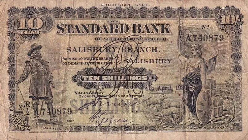Banknote Rhodésie 10 Shillings - Standard Bank Salisbury Brach - 04-041936 - Serial A