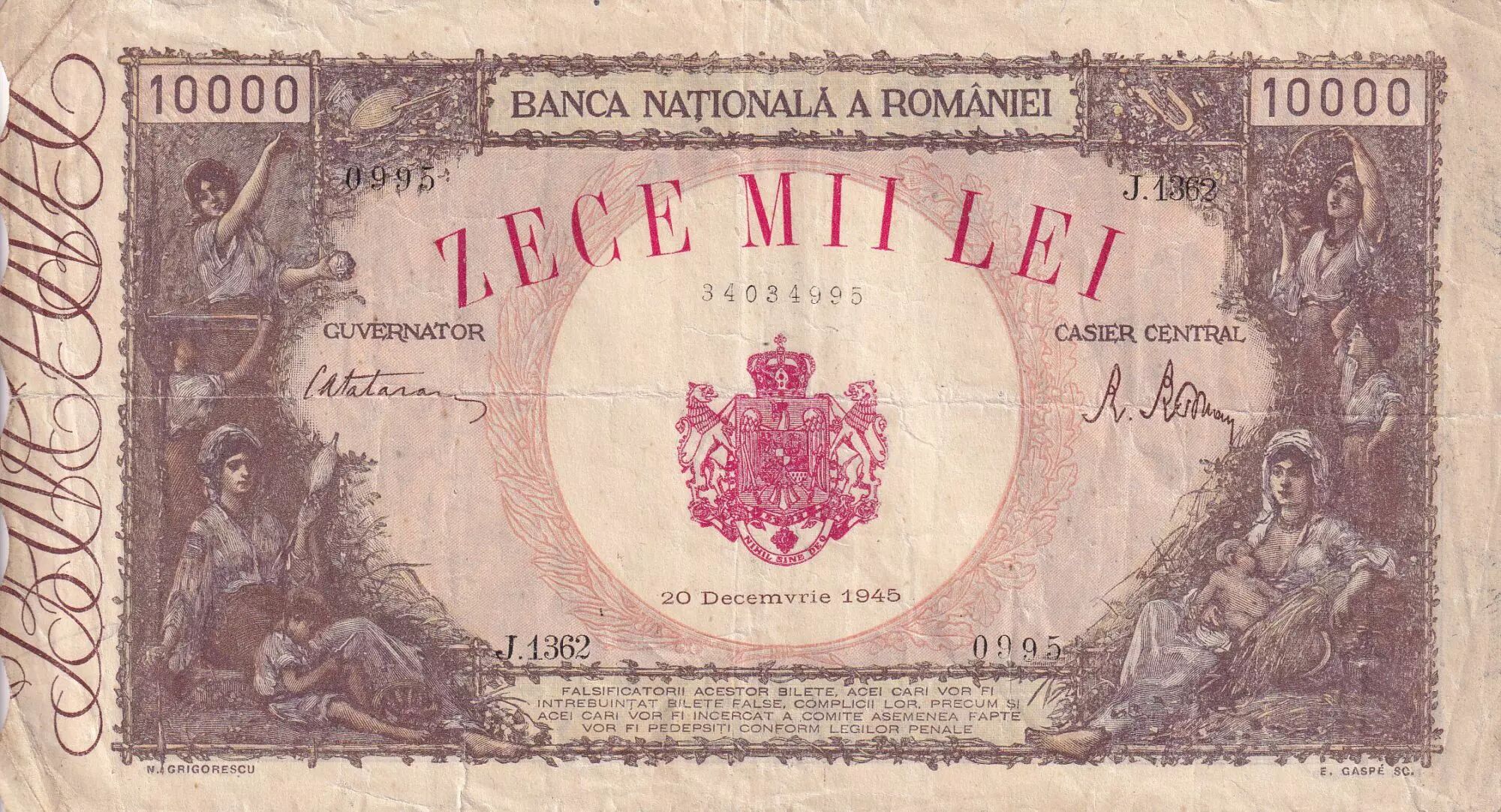 Banknote Romania 10 000 Lei - Women & Childs- 20-12-1945 - Serial J.1362 - P.57