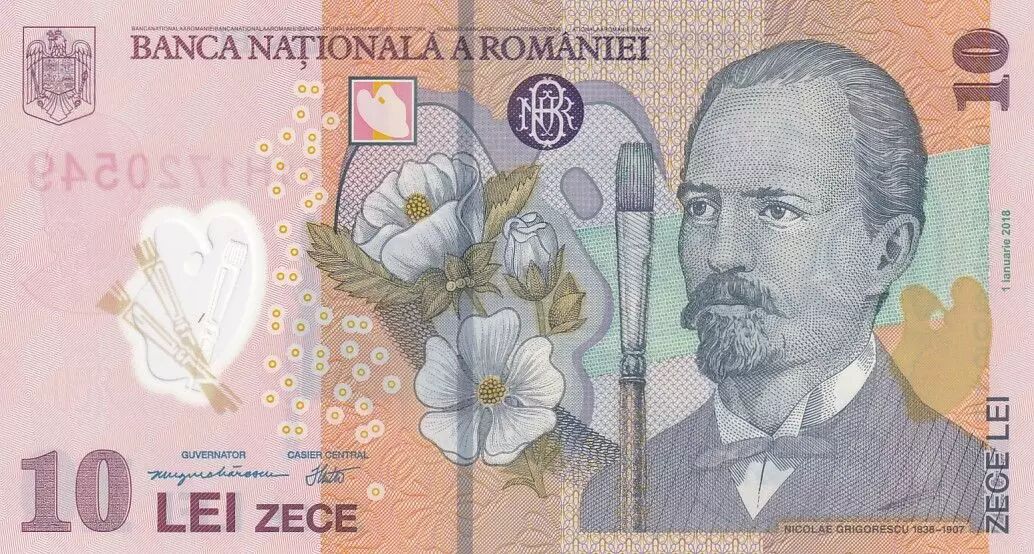 The 10 Lei banknote issued by the Banca Na?ional? a României in 2023 is part of the 231H series. This banknote commemorates Nicolae Grigorescu, an emblematic figure in Romanian painting. The banknote is 135 mm long and 72 mm wide.