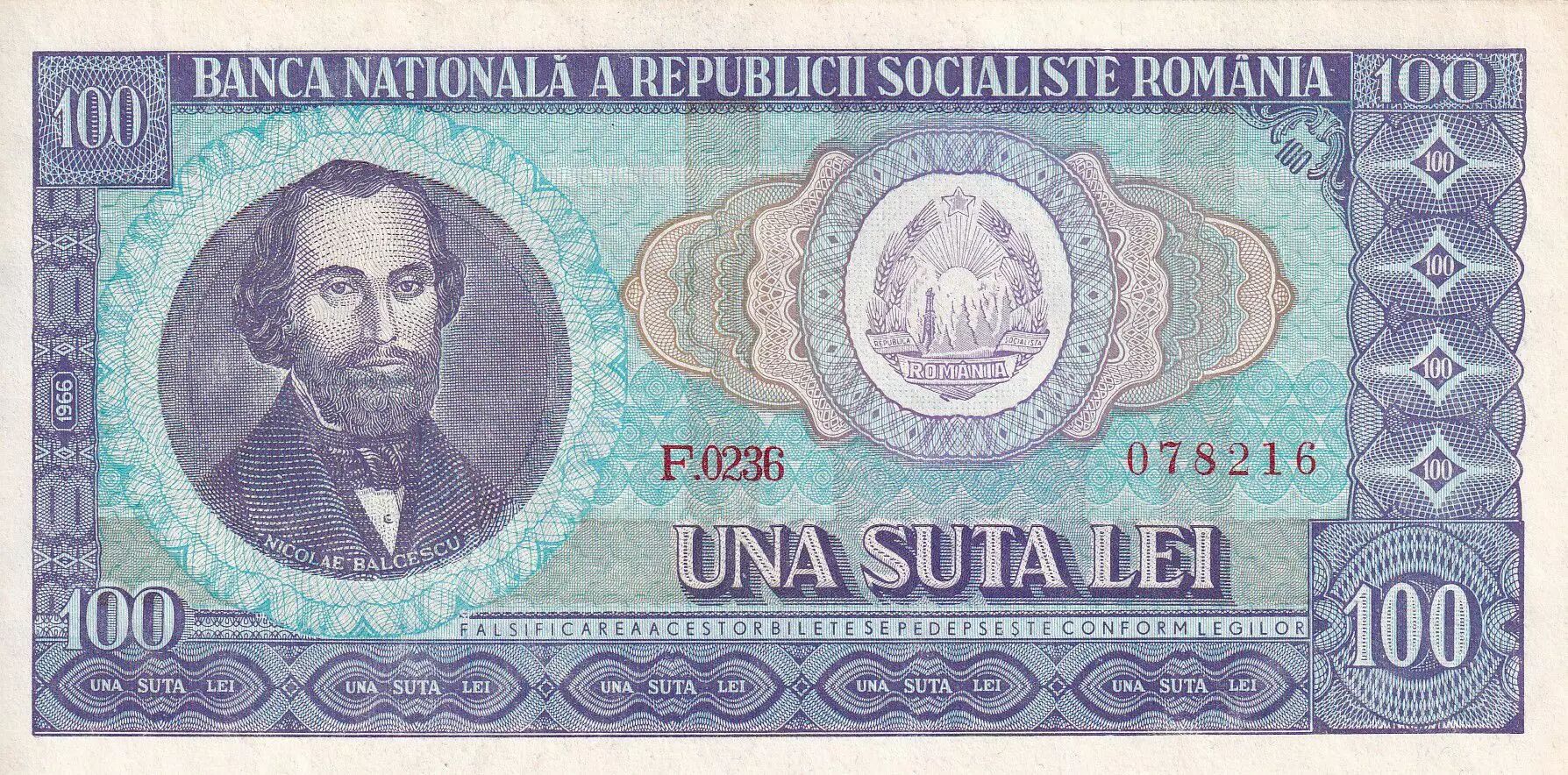 Home > > Romania 100 Lei - Nicolae Balcescu - 1966 - Serial F.0236 - P.97