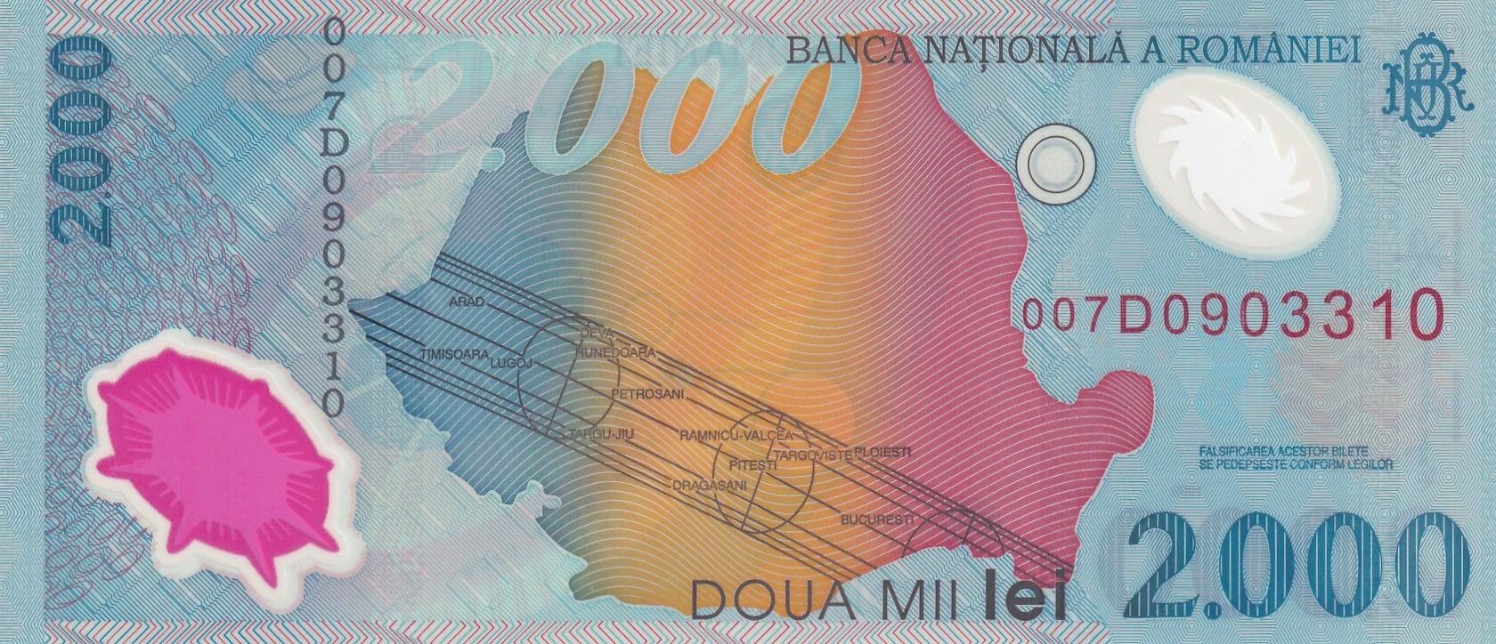 The banknote, with a face value of 2000 lei, was issued in 1999 and is made of polymer. It weighs 1 gram and measures 143 millimeters long by 63 millimeters wide.