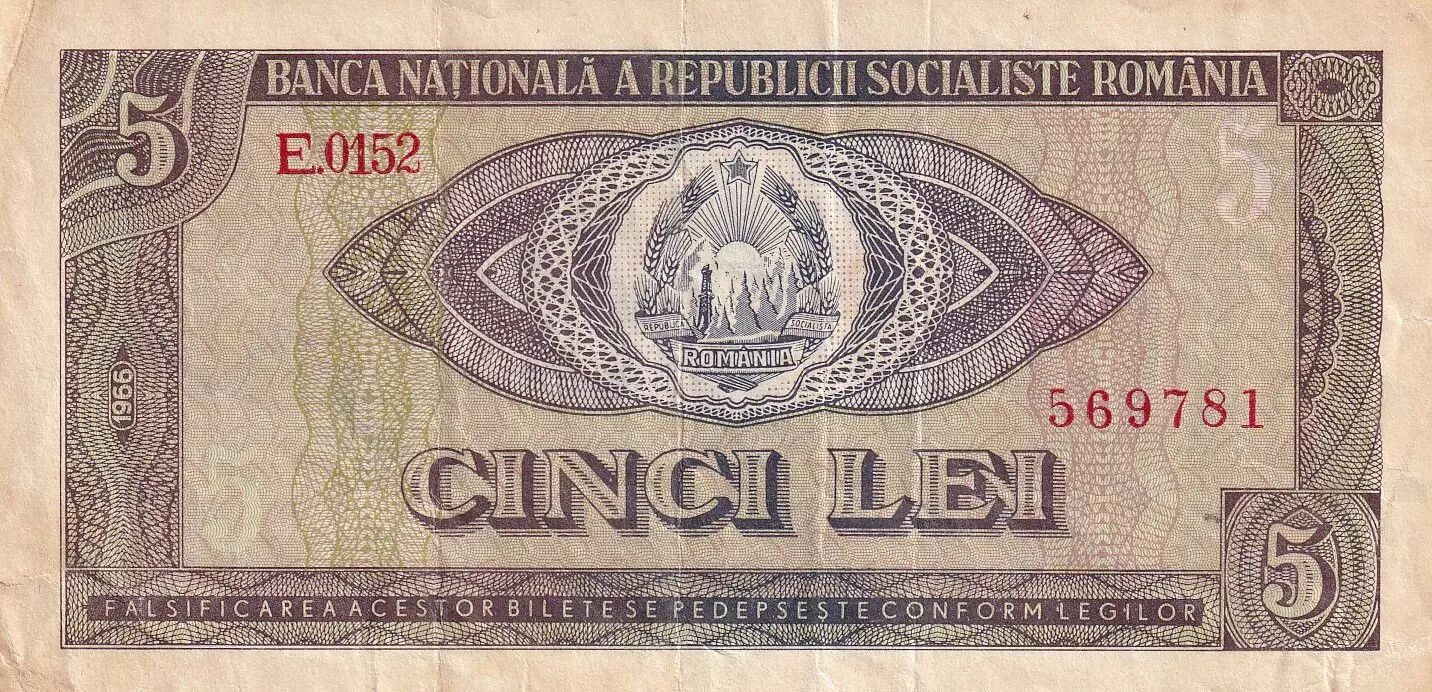 Banknote Romania 5 Lei - Arms - Harbor - 1966 - P.93