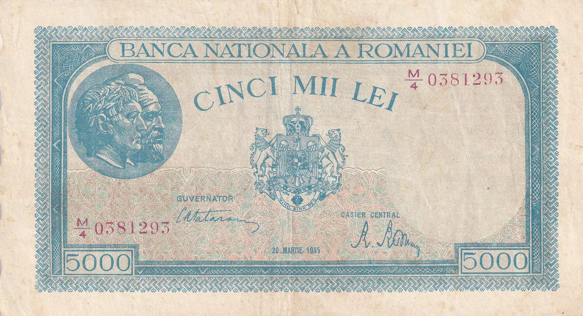 Home > > Romania 5000 Lei - Trajan & Decebal - 20-03-1945 - Serial M.4 - P.56