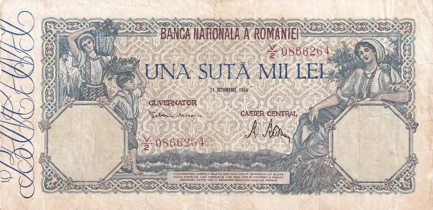 Billet Roumanie 100 000 Lei - Femmes - Agriculture - 21-10-1946 - Série V.2 - P.58