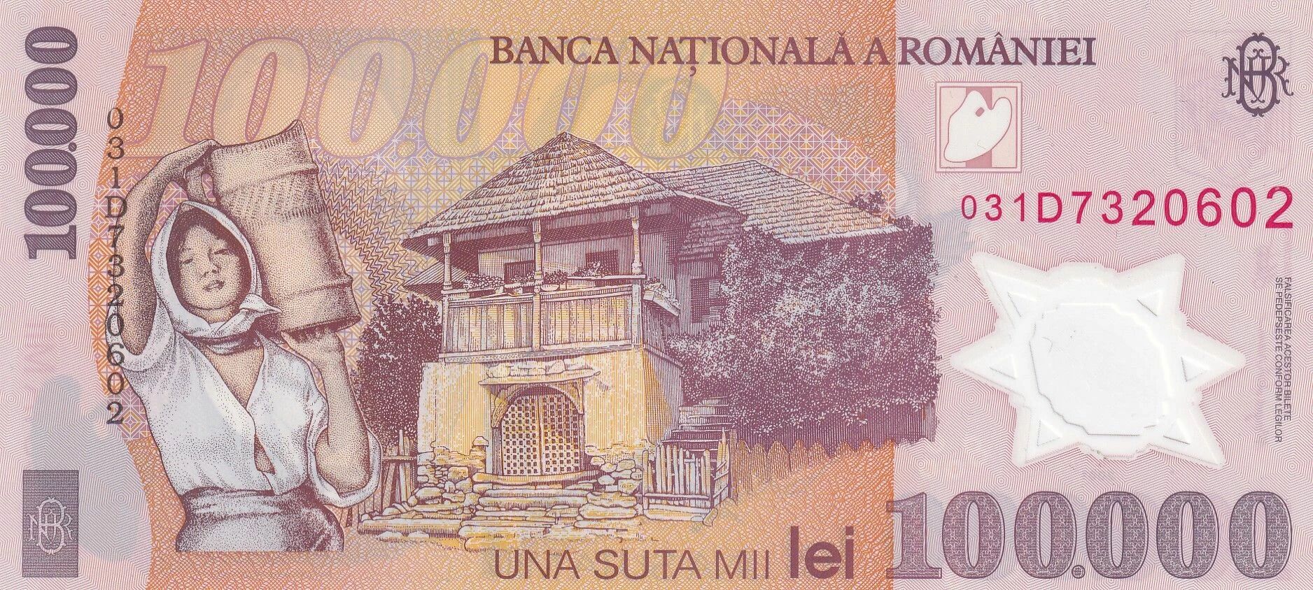 Ce billet de banque est émis par la Roumanie et date de l'année 2001. Il possède une valeur nominale de 100 000 lei. Le matériau utilisé pour sa fabrication est le polymère, ce qui lui confère une durabilité accrue. Son poids est d'un gramme.