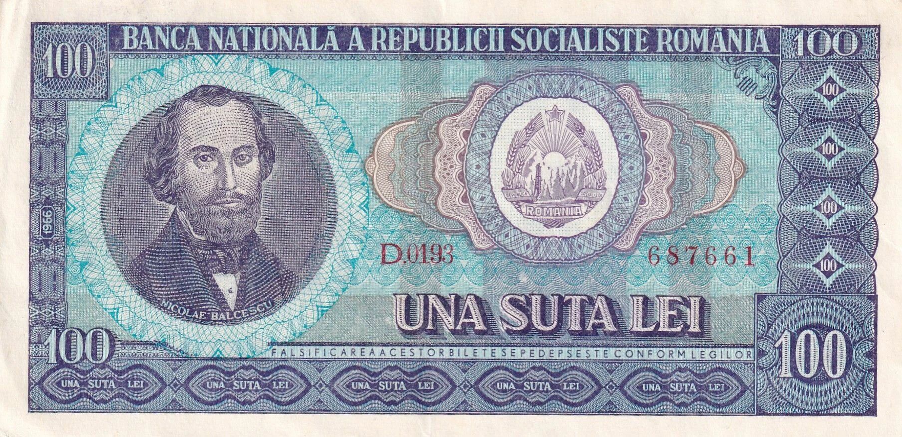 Le billet de 100 Lei, émis en Roumanie en 1966, représente une valeur nominale de cent Lei. Ce billet appartient à la série D.