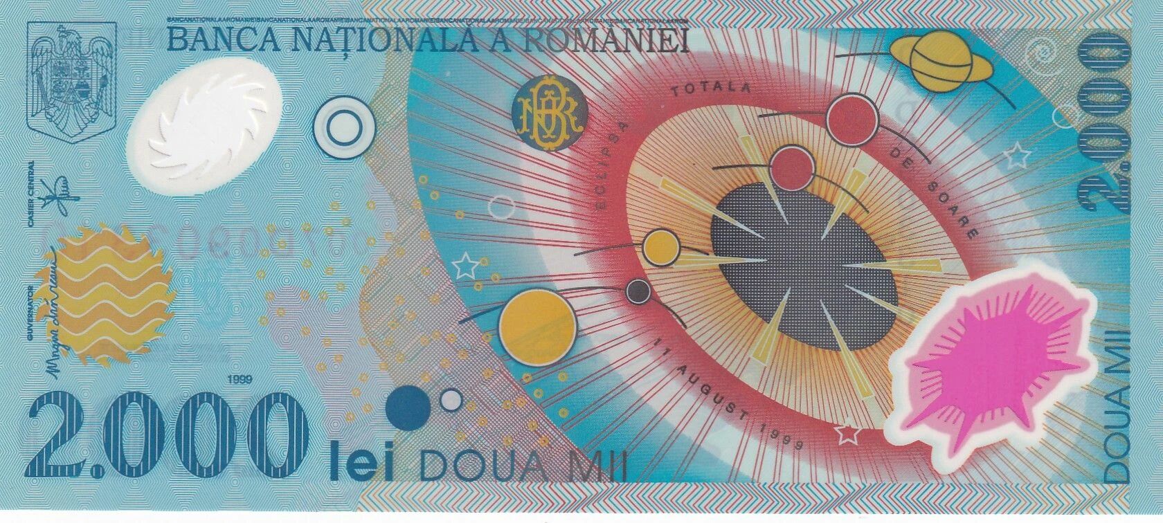 L'avers du billet présente une représentation du système solaire. Les inscriptions sur cette face sont en langue latine et incluent la mention "BANCA NA?IONAL? A ROMÂNIEI", suivie de "ECLIPSA TOTAL? DE SOARE 11 AUGUST 1999". La valeur nominale, "2.000 DOU? MII", est également inscrite, accompagnée des mentions "GUVERNATOR" et "CASIER CENTRAL", ainsi que de l'année d'émission, "1999". La valeur nominale "2.000 lei DOU? MII" est répétée.