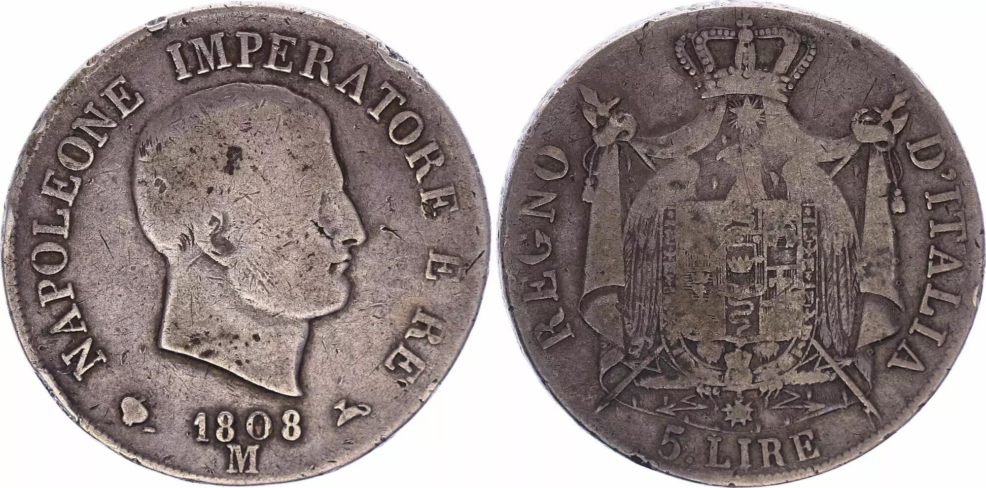 Pièce Royaume de Napoléon 5 lire Napoléon I - 1808 M Milan - Argent - KM.10