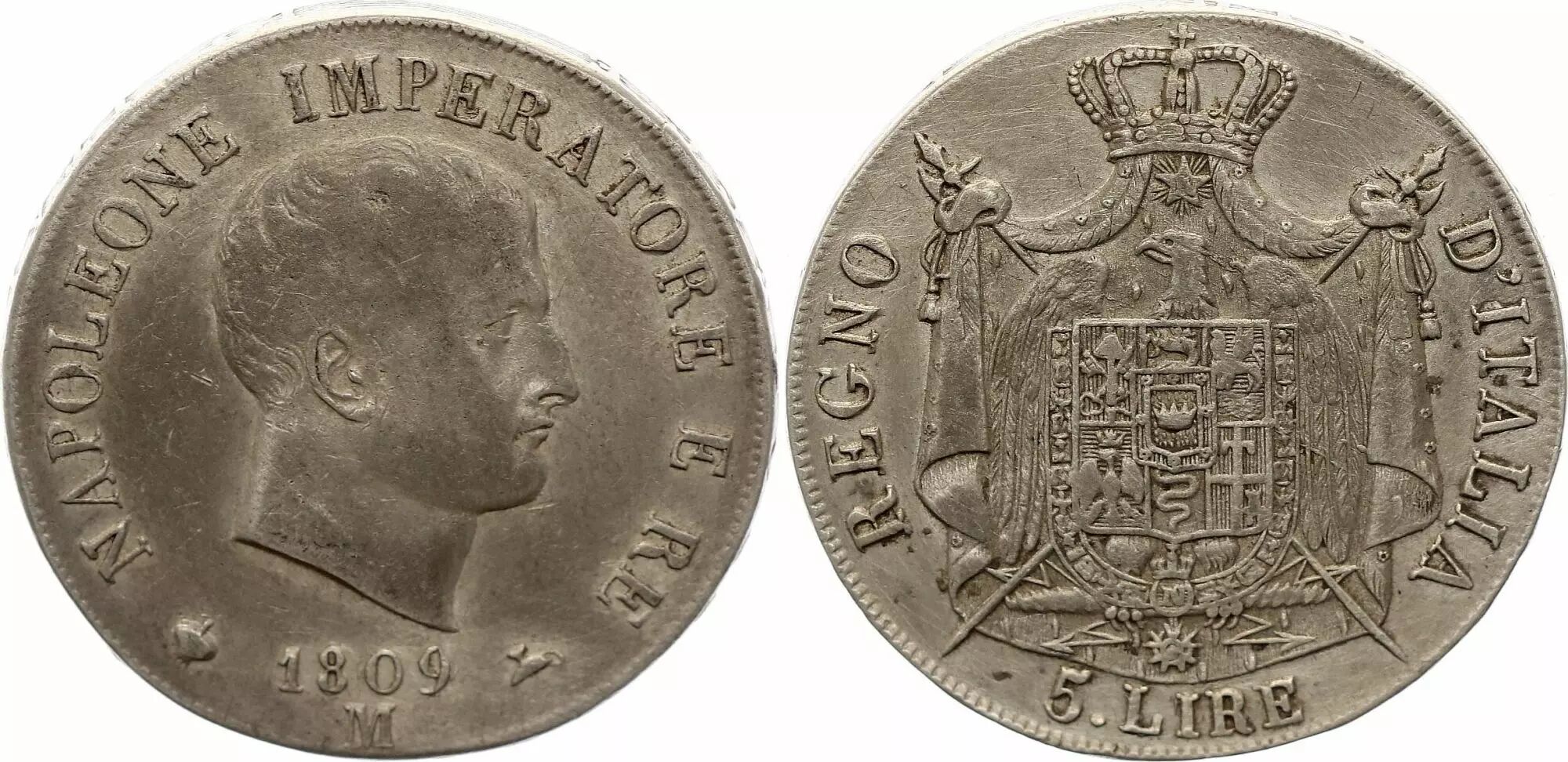 Pièce Royaume de Napoléon 5 lire Napoléon I - 1809 M Milan - Argent