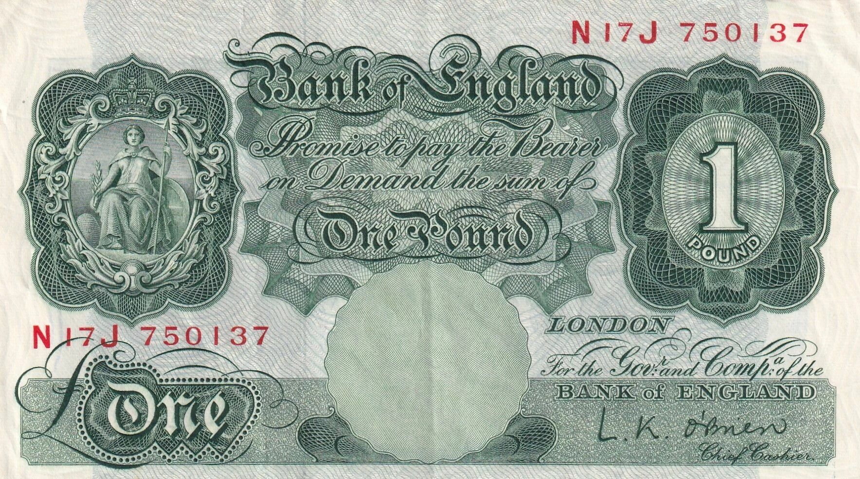 Ce billet de banque est émis par le Royaume-Uni et possède une valeur nominale d'une livre sterling. La période d'émission s'étend de 1948 à 1960.