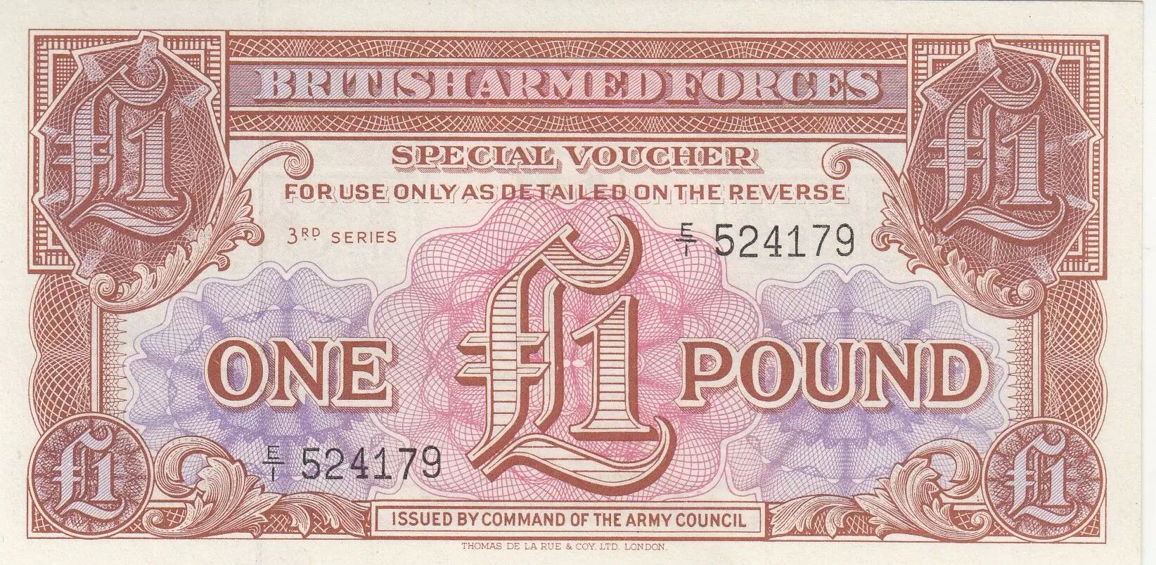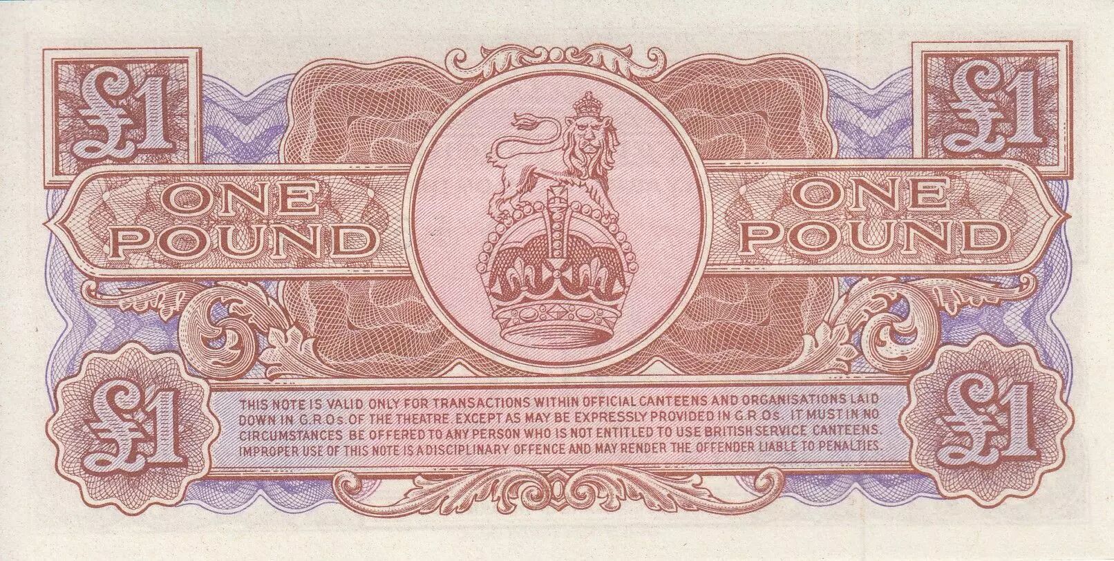 Au recto, on observe une composition où prédomine une teinte bleue rehaussée de détails rouges. Le centre du billet est occupé par une représentation de Britannia, figure allégorique de la Grande-Bretagne. Elle est assise, tenant un trident dans sa main droite et un bouclier orné de l'Union Jack dans sa main gauche. Des motifs complexes et ornementaux encadrent cette figure centrale. La valeur nominale, « ONE POUND », est clairement indiquée en lettres majuscules. La mention « BRITISH ARMED FORCES » est également présente, soulignant la destination spécifique de ce billet.