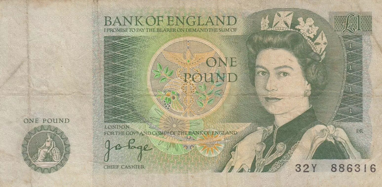 L'avers du billet met en évidence un portrait de la reine Élisabeth II, réalisée par Harry Eccleston, portant une robe de cour, positionnée sur le côté droit. Les inscriptions "BANK OF ENGLAND", "I PROMISE TO PAY THE BEARER ON DEMAND THE SUM OF ONE POUND" et "LONDON" sont clairement imprimées, accompagnées de la mention "FOR THE GOVr. AND COMPa. OF THE BANK OF ENGLAND".