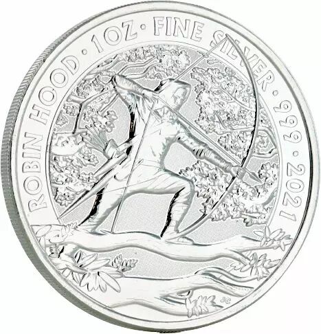 Robin des Bois apparaît dans le folklore britannique vers le milieu du Moyen-Age. Son histoire évoluera énormément jusqu'au XVIe siècle où plusieurs auteurs structurèrent le récit de façon plus proche de celui que l'on connaît de nos jours. Archer hors-pair il volait les riches pour donner aux pauvres. Bien que ce récit soit légendaire son objectif d'attention aux plus faibles de la société a encore de nombreuses résonances aujourd'hui. Dans le cadre des cette collection les prochains personnages qui devraient orner de futurs bullions sont Marianne et Petit Jean. Robin des Bois est représenté l'arc tendu caché dans les branches d'un arbre. Le dessin a été créé par Jody Clark à l'origine également du cinquième et actuel portrait de la Reine Elizabeth II.