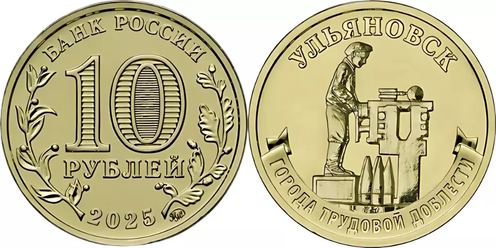 This 10-ruble coin, minted in Russia, commemorates the Ulyanovsk Oblast. The year of issue is 2025.