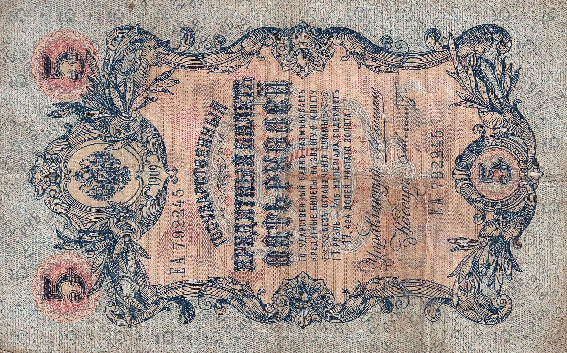 Banknote Russian Federation 5 Rubles - Imperial eagle - 1909 - Sign. Konshin (1909-1912) - P.10a