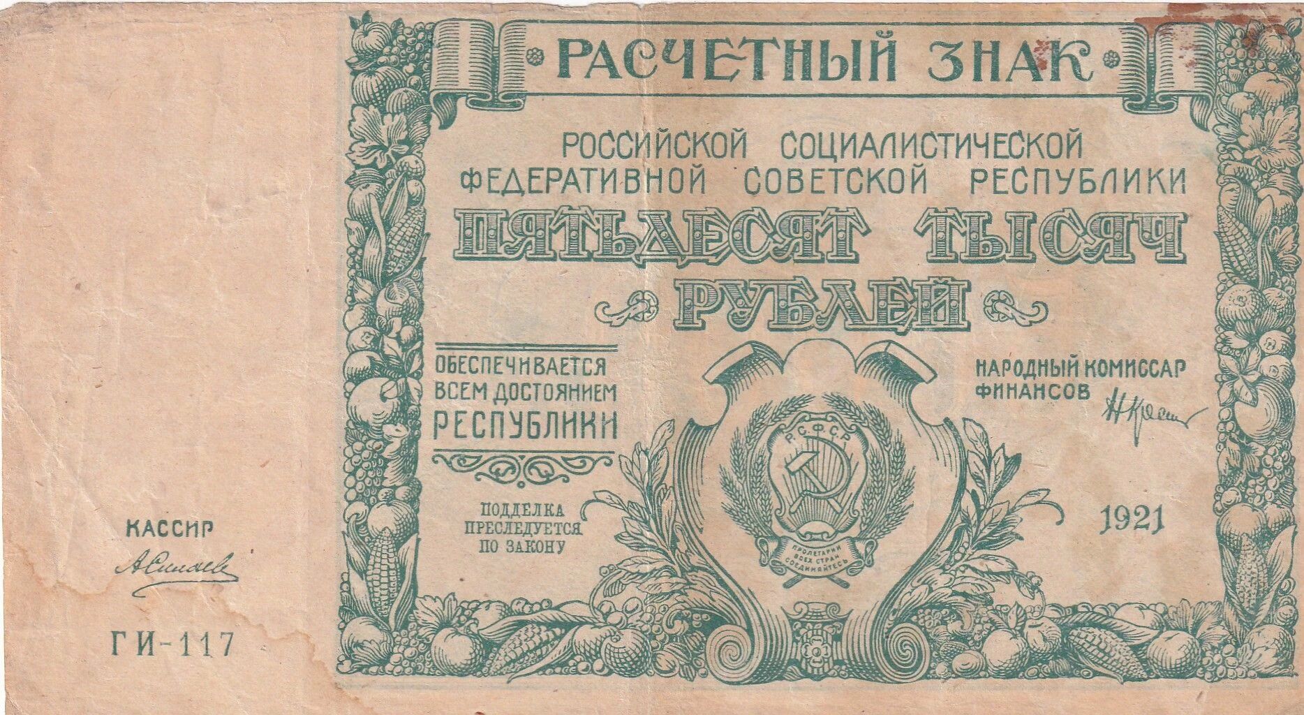 This banknote was issued in Russia and has a face value of 50,000 rubles. The year of issue is 1921.