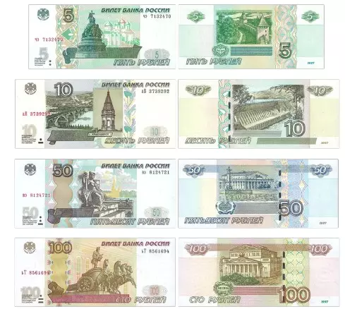 This set includes four Russian banknotes, each representing a distinct denomination: 5 rubles, 10 rubles, 50 rubles, and 100 rubles. All banknotes in this series were issued in 1997.
