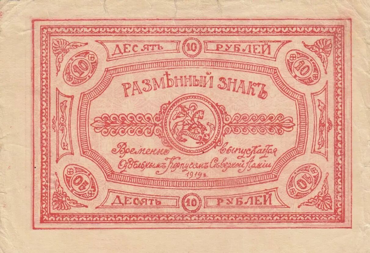 Ce billet de 10 roubles témoigne du contexte monétaire et économique de la Russie en 1919, une période potentiellement marquée par des changements politiques et sociaux significatifs. L'iconographie et la conception du billet reflètent les symboles et les valeurs de l'époque, offrant un aperçu visuel de l'identité culturelle et historique associée à cette émission monétaire.
