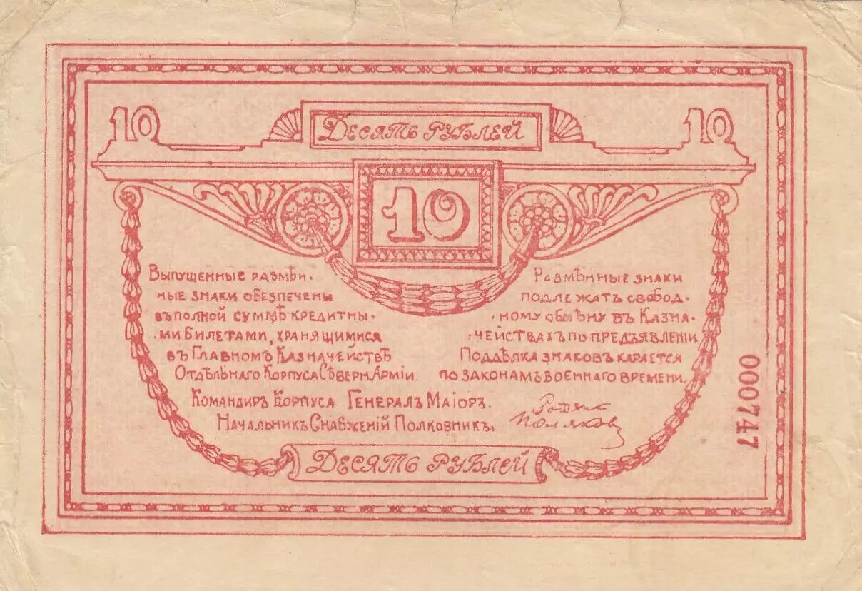 Ce billet de banque, d'une valeur nominale de 10 roubles, a été émis en Russie en 1919. Il s'agit d'un spécimen de type PS.0222.